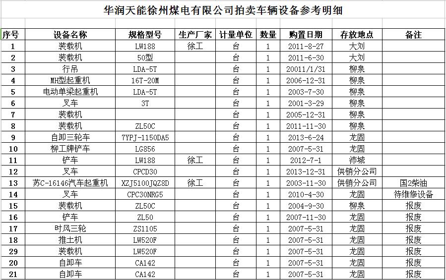 我公司受委托,定于2017年4月12日10時(shí)在徐州市中山南路55號(hào)7樓本公司大廳公開拍賣華潤天能徐州煤電有限公司各型車輛設(shè)備約二十余臺(tái),主要包括各型裝載機(jī)、叉車、起重機(jī)、鏟車、推土機(jī)、自卸車等。