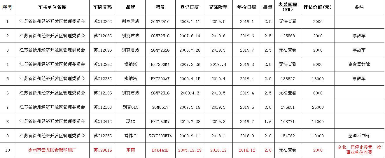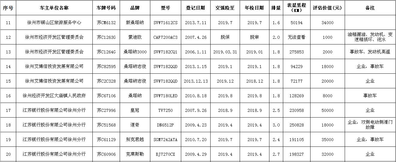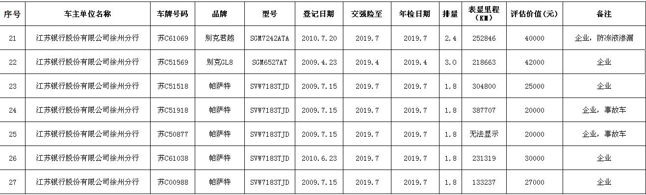 關(guān)注微信公眾號我公司受委托,定于2018年9月14日10時在中山南路55號三樓本公司拍賣廳公開拍賣:江蘇銀行股份有限公司徐州分行、徐州經(jīng)濟技術(shù)開發(fā)區(qū)、銅山區(qū)、云龍區(qū)公務(wù)車輛二十余輛。主要車型有帕薩特、皇冠、道奇、別克、克萊斯勒等。