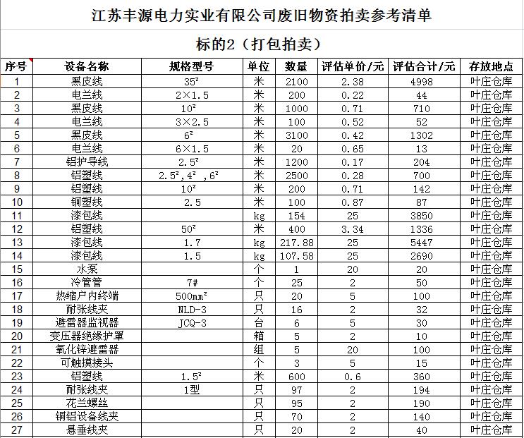 關(guān)注微信公眾號(hào)受江蘇徐供集體資產(chǎn)運(yùn)營中心委托,我公司將通過中國拍賣行業(yè)協(xié)會(huì)網(wǎng)絡(luò)拍賣平臺(tái)以網(wǎng)絡(luò)競價(jià)的方式分兩批公開拍賣其下屬三家集體企業(yè)廢舊物資,主要包括:廢舊電纜、纜芯、鋼帶、導(dǎo)線、開關(guān)、電表、金具、廚房設(shè)備等(詳見拍品目錄)。