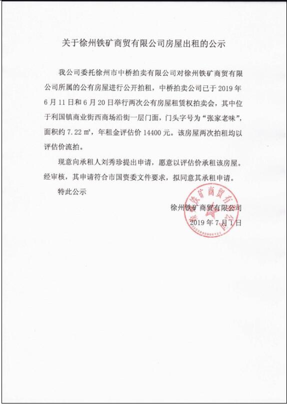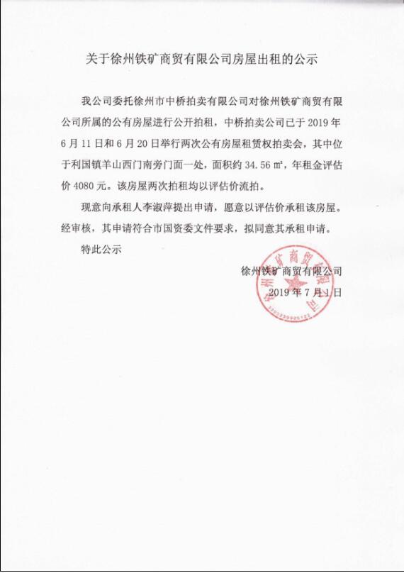 關(guān)于徐州鐵礦商貿(mào)有限公司房屋出租的公示