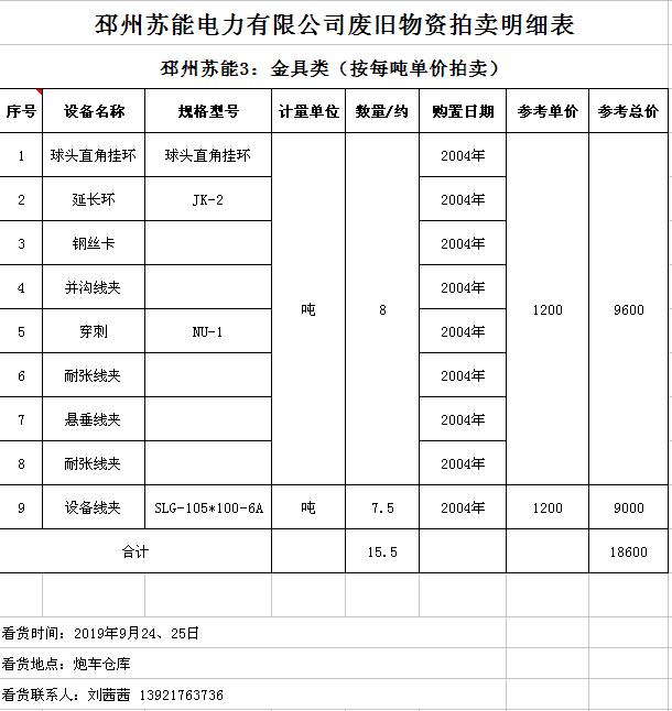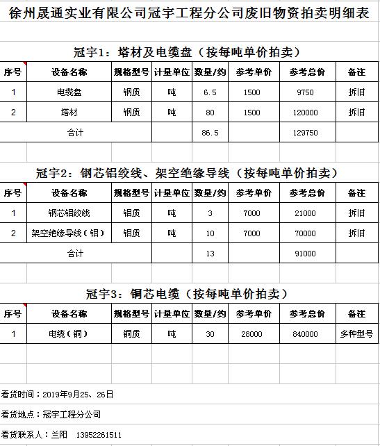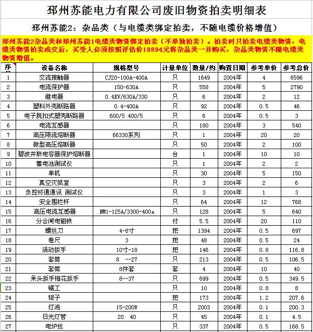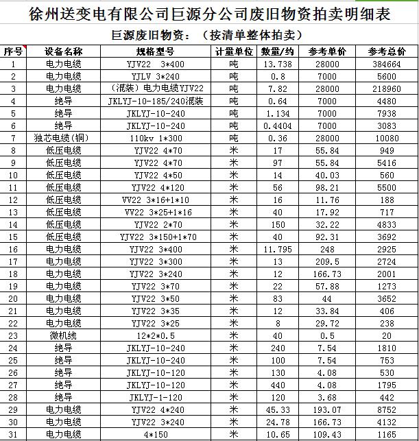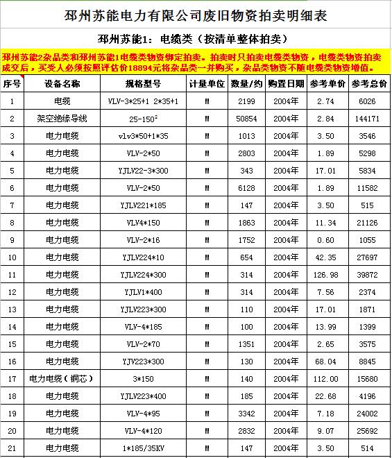 關(guān)注微信公眾號(hào)受委托,我公司將通過(guò)中國(guó)拍賣行業(yè)協(xié)會(huì)網(wǎng)絡(luò)拍賣平臺(tái)以網(wǎng)絡(luò)競(jìng)價(jià)的方式公開(kāi)拍賣廢舊電力物資一批,主要包括:電纜、導(dǎo)線、廢舊鋼材、鋼芯鋁絞線、金具、雜品、機(jī)具、空調(diào)、辦公設(shè)備等。