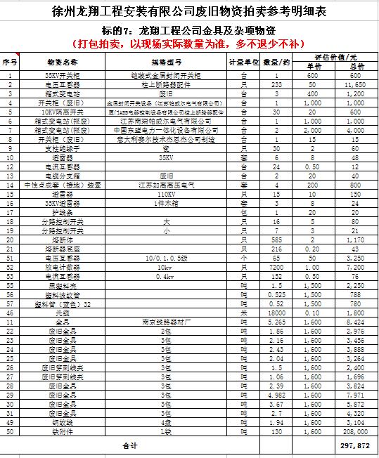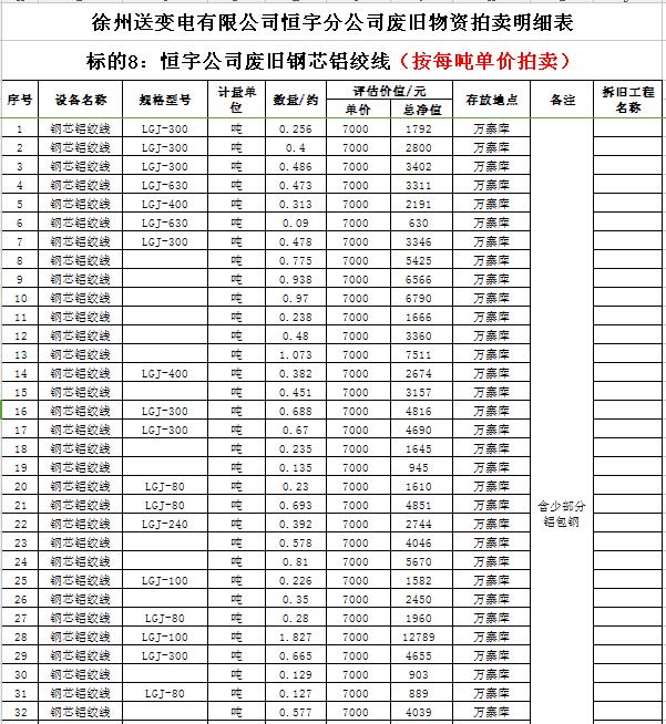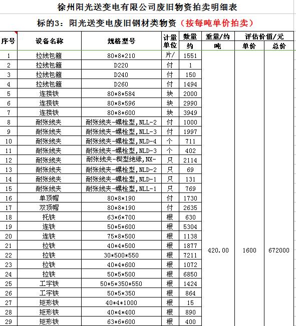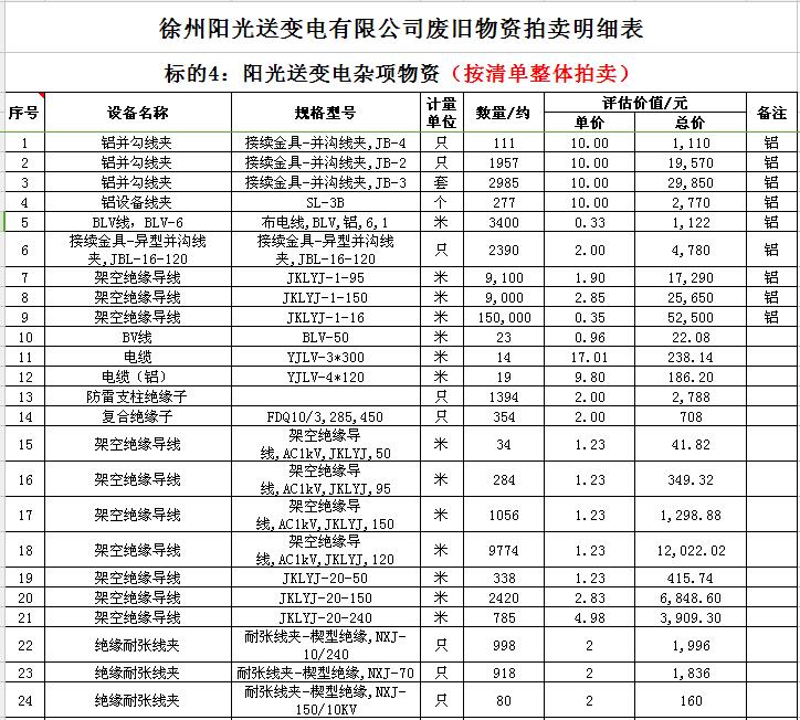 關(guān)注微信公眾號(hào)受委托,我公司將通過(guò)中國(guó)拍賣(mài)行業(yè)協(xié)會(huì)網(wǎng)絡(luò)拍賣(mài)平臺(tái)以網(wǎng)絡(luò)競(jìng)價(jià)的方式公開(kāi)拍賣(mài)以下公司廢舊電力物資。主要包含:廢銅排下腳料、廢不銹鋼、辦公設(shè)備等;架空絕緣導(dǎo)線(xiàn)、電纜、金具、角鋼塔、鋼芯鋁絞線(xiàn)、開(kāi)關(guān)、互感器、變壓器散件等。