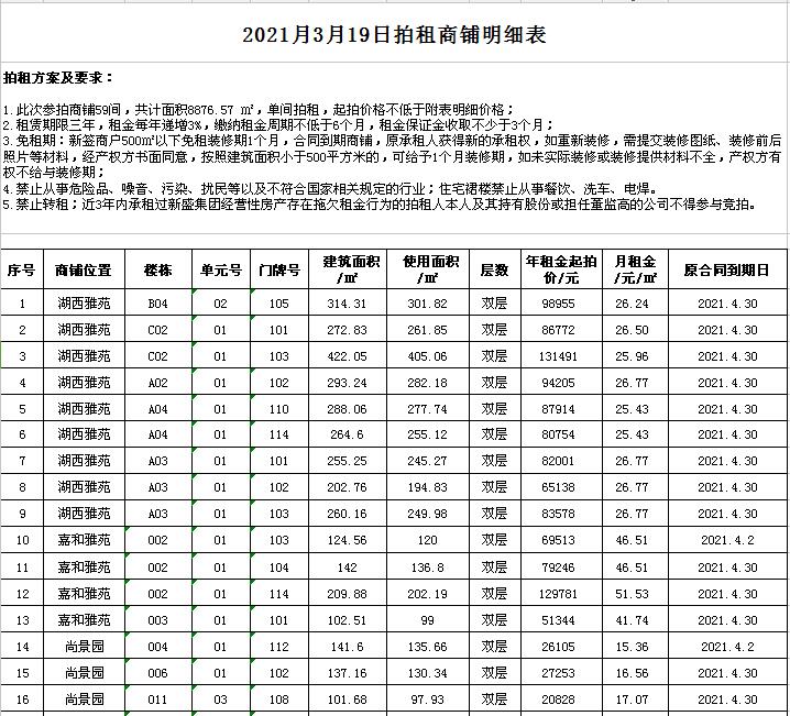 關(guān)注微信公眾號(hào)我公司受委托,定于2021年3月19日9:30時(shí)在徐州市云泉山莊主樓3樓第七會(huì)議廳公開拍租以下商鋪:湖西雅苑16間、嘉和雅苑5間、漢襄佳苑6間、尚景園5間、玉潭佳苑8間、紫荊園2間、玉棠苑1間、楓情水岸4間、和風(fēng)雅致12間。面積分別約為數(shù)十至三百余平米不等,租期均為三年。