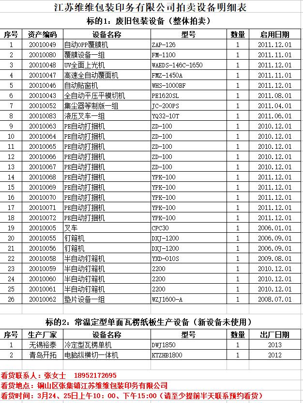 1、江蘇維維包裝印務(wù)有限公司廢舊包裝設(shè)備一批。