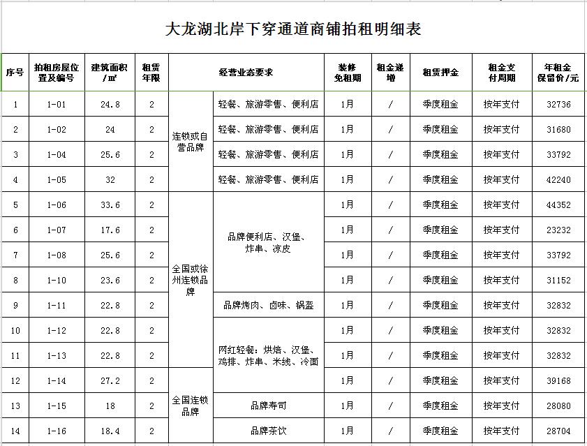 ②拍租順序自明細表序號14-1(16號商鋪-1號商鋪)依次競拍,為保證商鋪經(jīng)營業(yè)態(tài)的合理性,已競拍成功的品類或品牌不再重復競拍;