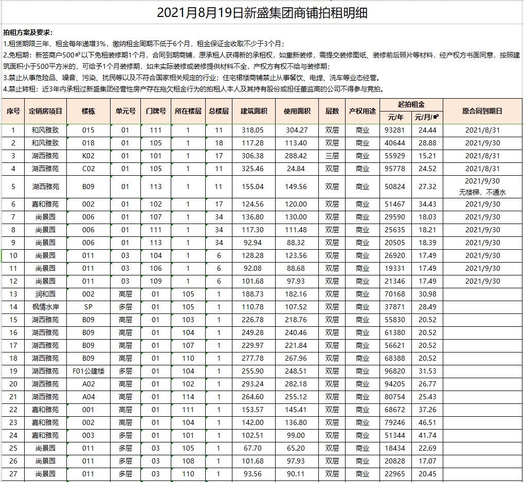 關注微信公眾號我公司受委托,定于2021年8月19日10時在徐州市中山南路55號本公司拍賣廳公開拍租以下商鋪:湖西雅苑10間、嘉和雅苑4間、尚景園13間、玉潭佳苑3間、康馨園3間、楓情水岸1間、潤和園1間、天瑞華府1間、和風雅致2間。面積分別約為數(shù)十至三百余平米不等,租期均為三年。